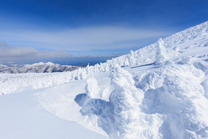 そんな、初心者のスキー練習に最適な「蔵王ライザワールドスキー場」で忘れてはならないのが、幻想的な樹氷や霧氷を間近で見られる「樹氷スノーシューハイク」。大自然が作り出した夜の樹氷を上空から体験できる「樹氷幻想回廊」ツアーにも、ぜひ参加してみてください。もし、チケットを買えなくてもご安心を。麓と山頂を結ぶロープウェイの窓からも、眼下に広がる樹氷の群を一望することができます。辺り一面に広がる樹氷の姿は圧巻です。