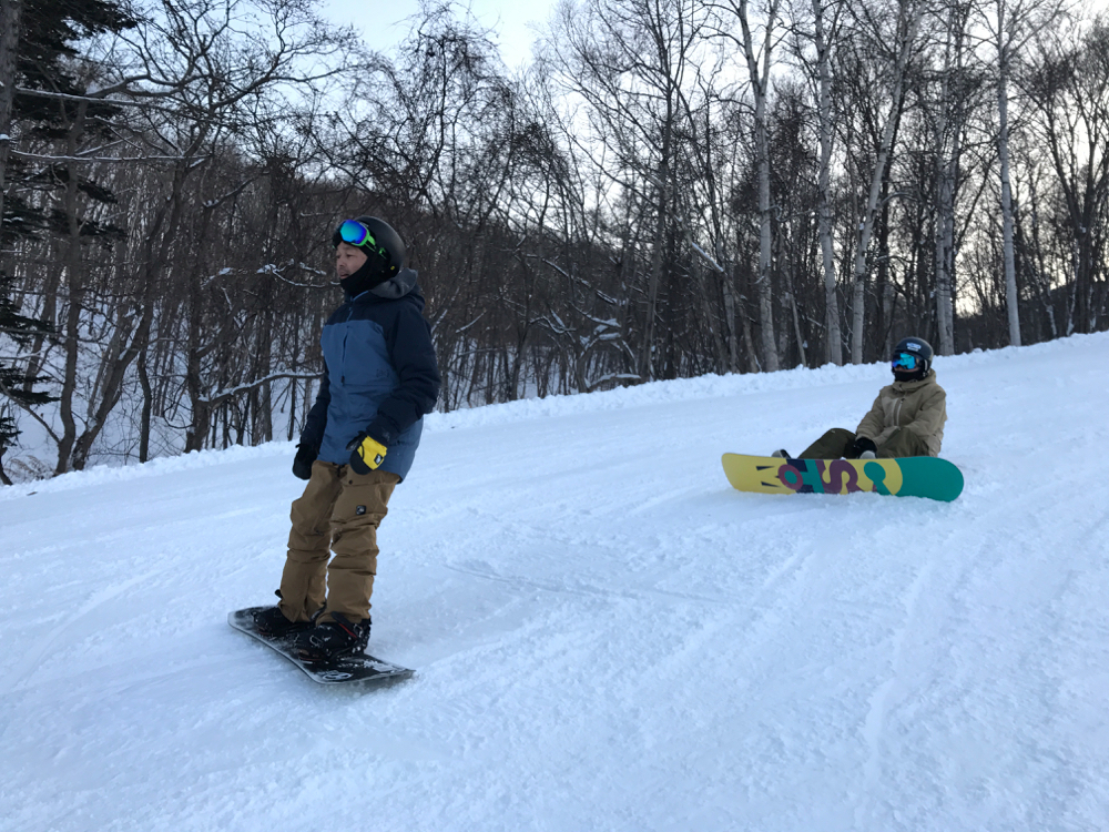 最初は斜面が良く見えるお尻側から立ち上がって、踵側のエッジを使って滑るバックサイドの止まり方を覚えましょう。