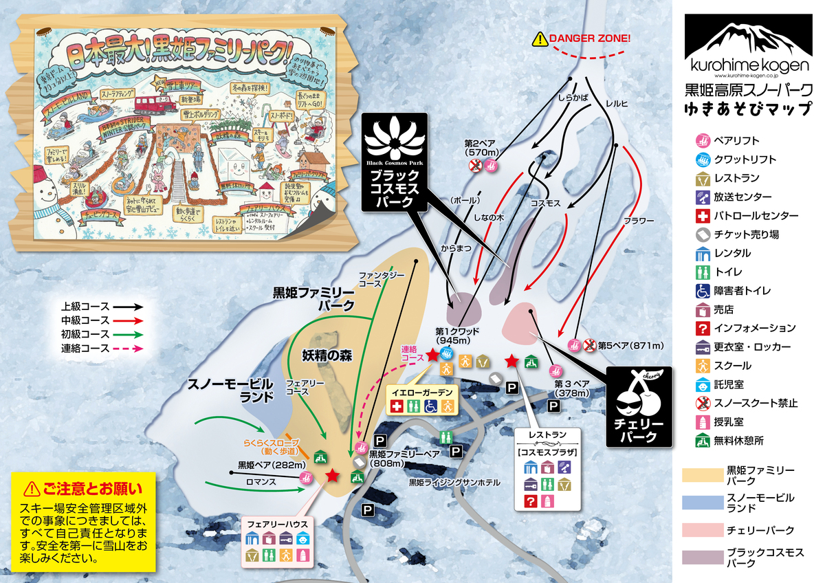 Snow STRIDERやソリ遊びをリフトに乗って出来る「黒姫KID´S&ファミリーパーク」は、エリア内で遊べる1000点以上の雪遊びアイテムが自慢。スキーやスノーボードはほどほどに、雪遊びを満喫したい方におすすめのエリア。ゲレンデは天然雪100%の見渡す限り純白のロケーションの中、のんびりとお過ごしいただけます。わんちゃんと一緒にリフトに乗れて、一緒に滑れる2つのコースと、広さ約5000㎡のリードなしで遊べるドッグランを新設。リフトで移動はちょっと不安というわんちゃんには、スノーモービルでけん引するラフティングボートでの移動サービスもあり。※記載情報は変更の可能性がございます。最新情報や詳細は公式HPよりご確認ください。