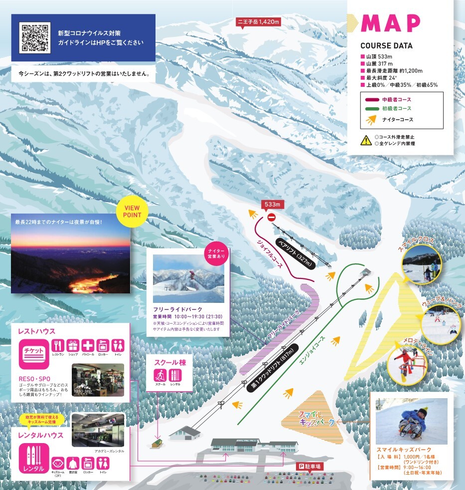 新潟市内から車で40分、豊かな積雪量と雪質が自慢のスキー場。 特にエンジョイゲレンデは、なだらかな1枚バーンで、斜度も緩く初心者でも安心! 【雪マジ】19歳~22歳は2回までリフト券が無料、3回目からは割引。18歳は【スマイル18】でリフト券が毎日無料。 毎週金・土はナイター営業22時まで遊び放題!仕事帰りでも気軽にこれちゃいます♪