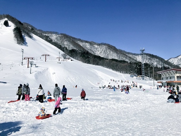 正面ゲレンデは緩やかで幅広く、初心者の方でも自分のペースでお楽しみ頂けます。ゲレンデの隣にある広大な「そり乗り場」と「雪遊び広場」は、スキー・スノーボード滑走禁止エリアとなっており、小さいお子様でも安心して遊ぶことができます。また、有料そりレンタルの他に、スコップや雪玉作り器、ゴムボールなど無料のレンタルも充実しています。